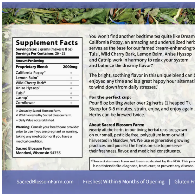 The Ultimate Bedtime Herbal Tea Farm fresh ingredients and potently efficacious herbs make Dream tea an outstanding herbal sleep remedy. California Poppy is a safe and potent nervine, and is the base of this blend. Tulsi, Wild Cherry Bark, Lemon Balm, Hyssop and Catnip work in harmony to relax your system. Caffeine Free / Gluten Free / No Flavorings / 100% Top Quality Medicinal Herbs