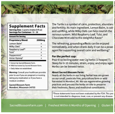 The Turtle is a symbol of calm, protection, abundance, and fertility. Our Turtle Tea’s main ingredient, Lemon Balm, is calming and uplifting, while Milky Oats can help nourish the nervous system. Wild Raspberry Leaf, Tulsi, and Chocolate Mint add to the delightful flavor. The refreshing and grounding effects of Turtle Tea can be enjoyed immediately, and when drank daily it can be a powerful agent for supporting overall calm and wellbeing. Caffeine Free / Gluten Free / No Flavorings / 100% Top Quality Medicinal Herbs
